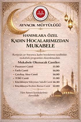 Ayvacık İlçe Müftülüğümüz tarafından Ramazan ayı boyunca kadın hocalarımız rehberliğinde mukabele programları düzenlenecektir.