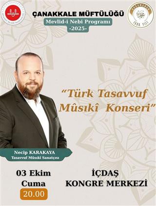 Çanakkale İl Müftülüğümüz tarafından düzenlenen Mevlid-i Nebi Programı kapsamında, 03 Ekim 2025 Cuma günü saat 20.00’de İÇDAŞ Kongre Merkezi’nde Tasavvuf Musikî Sanatçısı Necip Karakaya tarafından “Türk Tasavvuf Mûsikî Konseri” icra edilecektir.